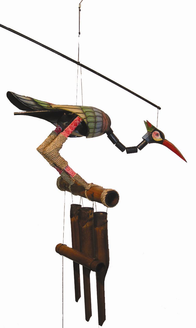 This unique chime is sure to grab attention! The colorful bird bobs in the breeze as three bamboo chimes play a soft tune. It sways and plays in the slightest bit of wind. This fanciful creature is made by artists in Bali